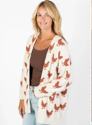 Wrap yourself in cozy luxury with this super soft cream cardigan, adorned with a charming brown chicken pattern. Perfect for chicken lovers who want to add a playful touch to their wardrobe while staying warm and comfortable. This luxe cardigan combines comfort and whimsy for everyday wear that feels as good as it looks. On a Mission for Feed The World - Inspired by the hardworking farmers who feed us all, we donate one meal with every purchase to a hungry child across the world. So, whether you eat or drink, or whatever you do, do all to the glory of God. 1 Corinthians 10:31 Specifications: Luxe Cardigan Brown Chicken 100% Polyester Colors may vary on different viewing devices) Care Instructions: To keep your items looking fresh and new as long as possible, we recommend the following: Machine wash cold with like colors, and hang to dry or tumble dry.