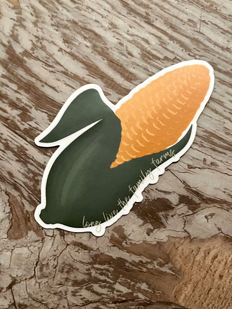 This sticker features an ear of corn with script lettering “long live the family farms” along the husk.