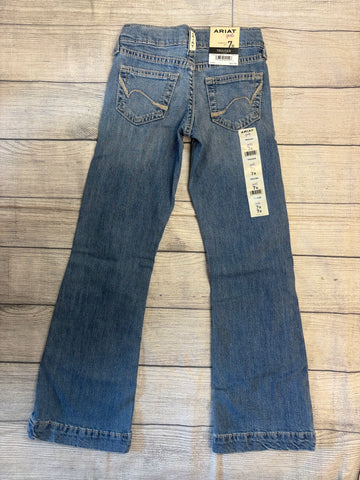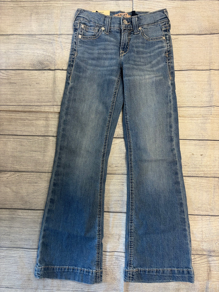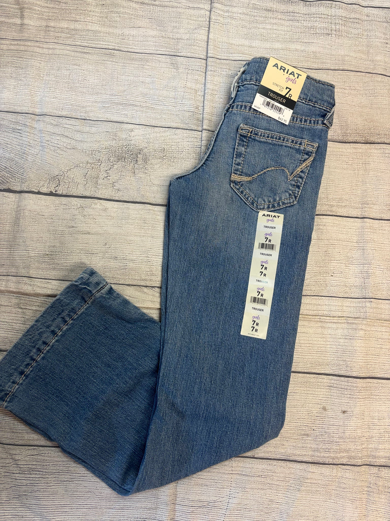 Rosalie…. a beautiful light wash denim trouser for the little ladies. A basic back pocket has that of a double stitched designer line across each pocket for a simple look. She is made for a stretch fit to allow for extra comfort in the overall fit. The waistline is designed with elastic bands on the inside of each side for an adjustable waist. Rosalie is perfect for the classroom, errands in town with mom, chores in the barn with dad, or a day in the show ring!