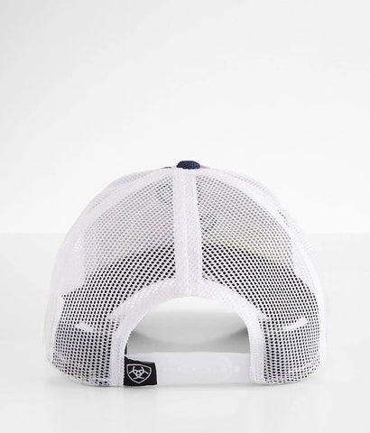 You will love this trendy Ariat ladies cap by M&F Western Products. The front of the cap is half serape print and half leopard print with a cactus in the middle. Ariat lettering embroidered down the cactus. The bill is denim with a white mesh back and snap closure