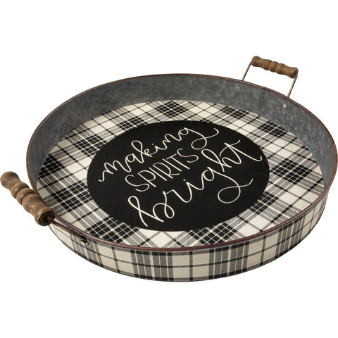 A round galvanized metal tray with a black and white plaid base and featuring a hand lettered "Making Spirits Bright" sentiment. Includes dual metal handles with wooden grips.