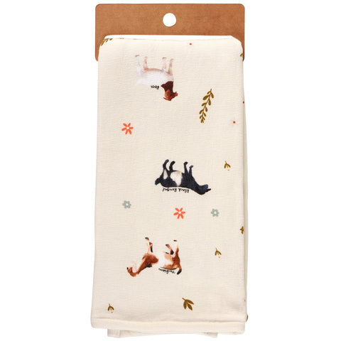 A cotton kitchen towel from our Homestead Collection displaying a goat inspired all-over design replicated from original hand illustrated art. Homestead design features illustrations of goats with their breed name and florals with a goat-themed sentiment on the front that reads "For The Love Of Goats." Goat design is printed on textured slub fabric with a coordinating green hem stitch at the bottom. Kitchen towel features a terrycloth layer on the back for added absorbency and corner loop for hanging. Our Love Of Goats kitchen towel is conveniently machine-washable for easy cleaning. Towel is packaged on a cardboard hanger with hole to easily display on rack. A fun farm-themed gift perfect for an everyday kitchen accessory.