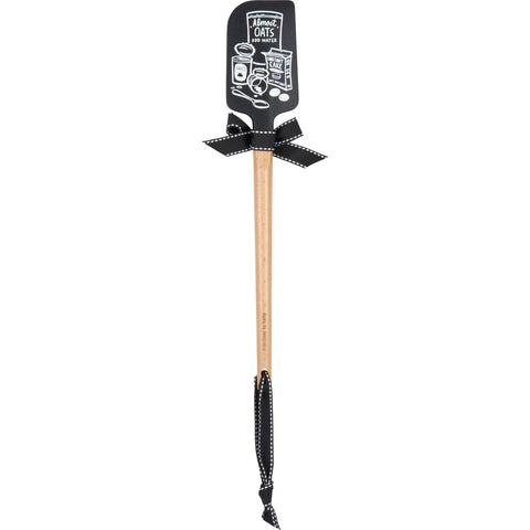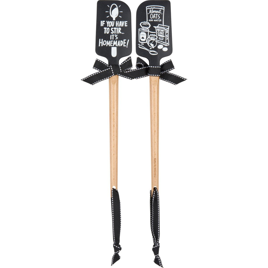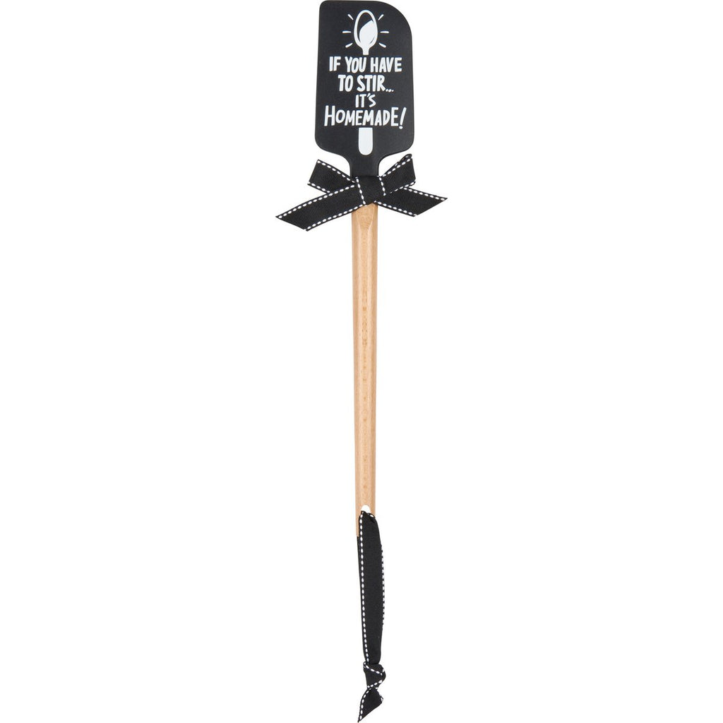 A double-sided silicone spatula from our LOL Made You Smile Collection displaying hand illustrated black and white designs on both sides. Design features ingredients on one side and "If You Have To Stir... It's Homemade!" sentiment on the other. Logo is engraved into wooden handle for added interest. Our If You Stir It's Homemade spatula includes a complementing decorative bow and hole at the bottom for hanging. Hand-wash recommended; not microwave safe. A fun everyday kitchen accessory