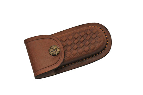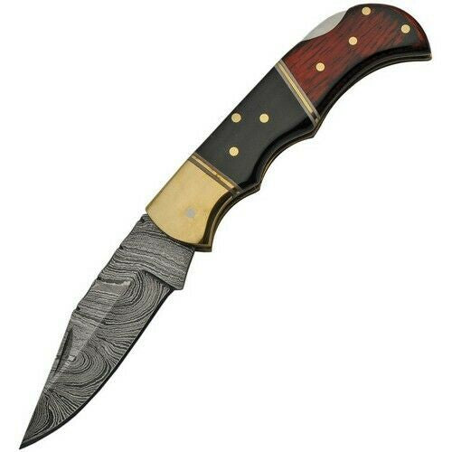 Lockback Wood and Horn. 3.75 inch closed. 2.75 inch Damascus steel clip point blade. Brass bolster(s). Buffalo horn and brown wood handle. Brown leather belt sheath.