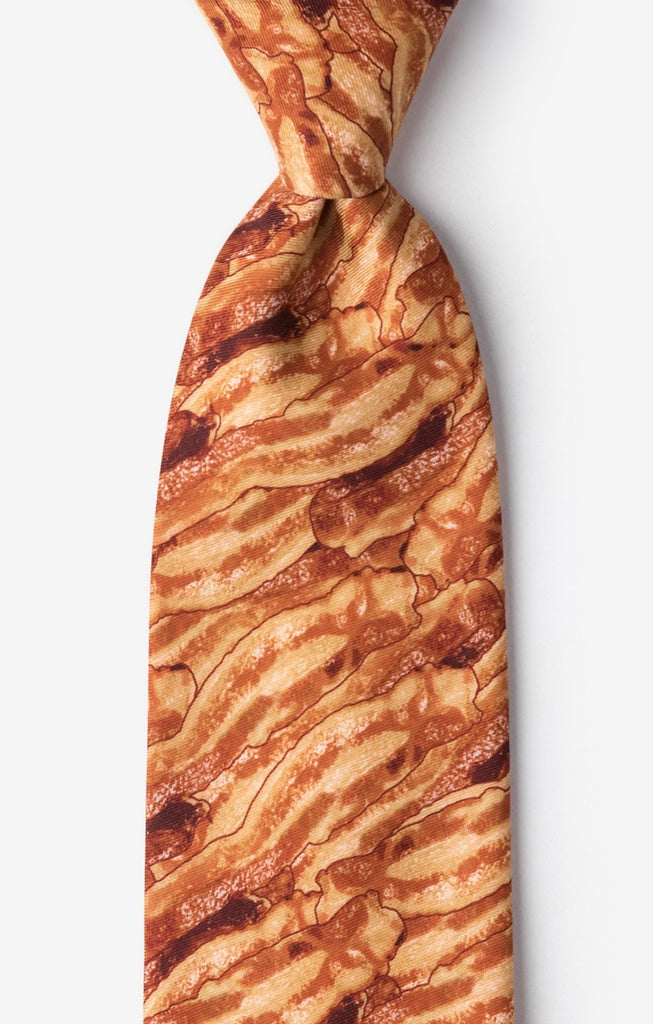 A Delicious silk screened necktie that will make you hungry for America's favorite food - BACON! The hottest trend in food-wear; enjoy the juicy strips of pork heaven around your neck! This men's necktie is beautifully designed and features strips of sizzling smoked bacon. Made of soft, comfortable, durable and stain resistant Microfiber that will last for many years.
