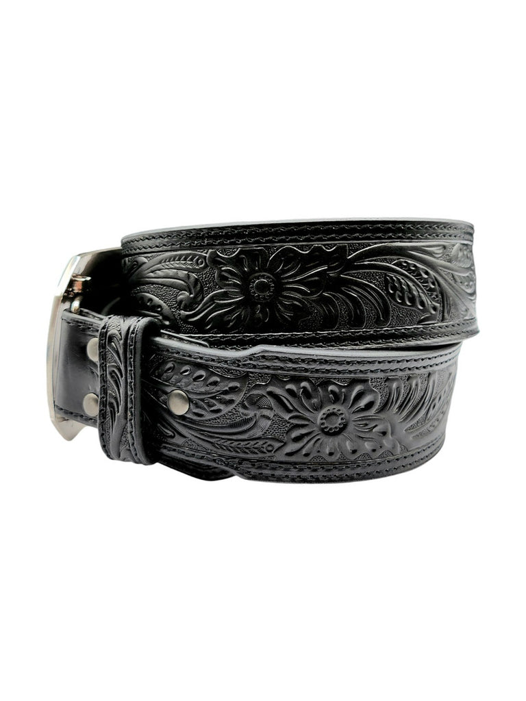 This Ariat men’s belt by M&F Western Products is genuine leather with a floral embossing on the strap. The multi finish Ariat plate buckle has a raised long horn motif in the center with scrolling engraved in the background.
