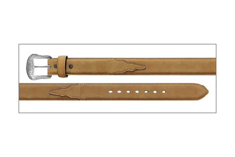 Crazy Horse strap with color blocked western tabs, padded with feathered edges. 7 oblong point end holes for “Better Fit” for all body types