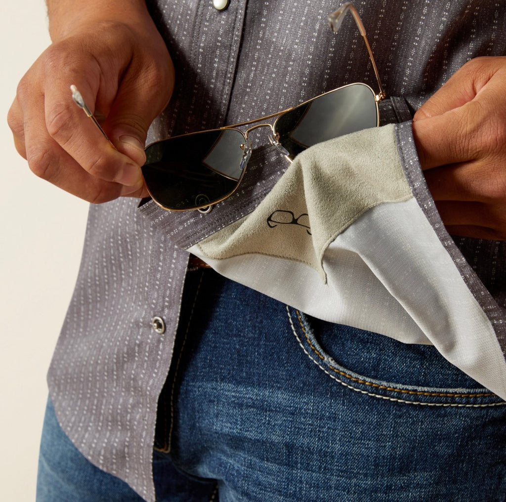 - Microfiber lens cloth is hidden in the hem for on-the-go cleaning