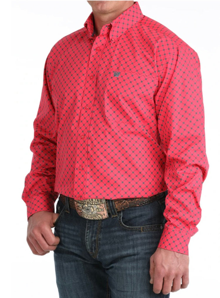 This CINCH men’s button down features a striking pink geometric print on durable cotton plain weave, offering breathable comfort from sunup to sundown. Finished with an open left front pocket, logo embroidery, and pink buttons, it’s the perfect way to add color and character to everyday blue jeans