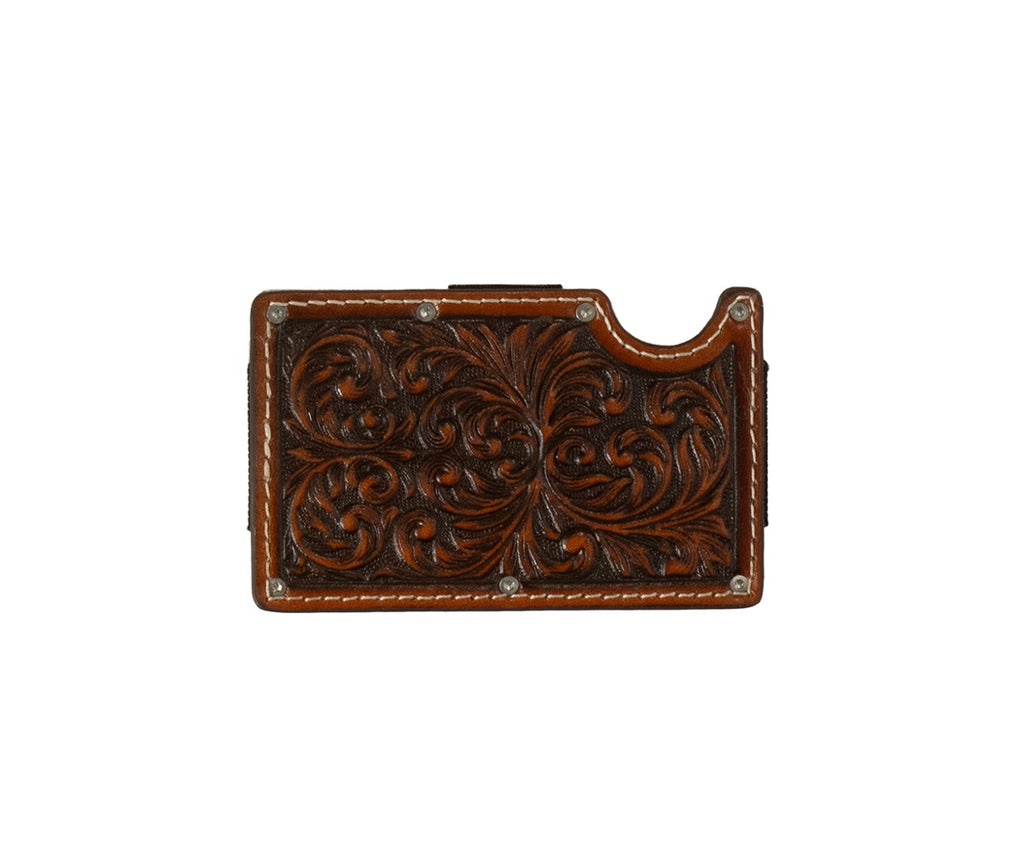 Decorative and stylish mens 3D smart wallet. Embossed scrolling design on the front with a matte silver back. RFID blocking technology.