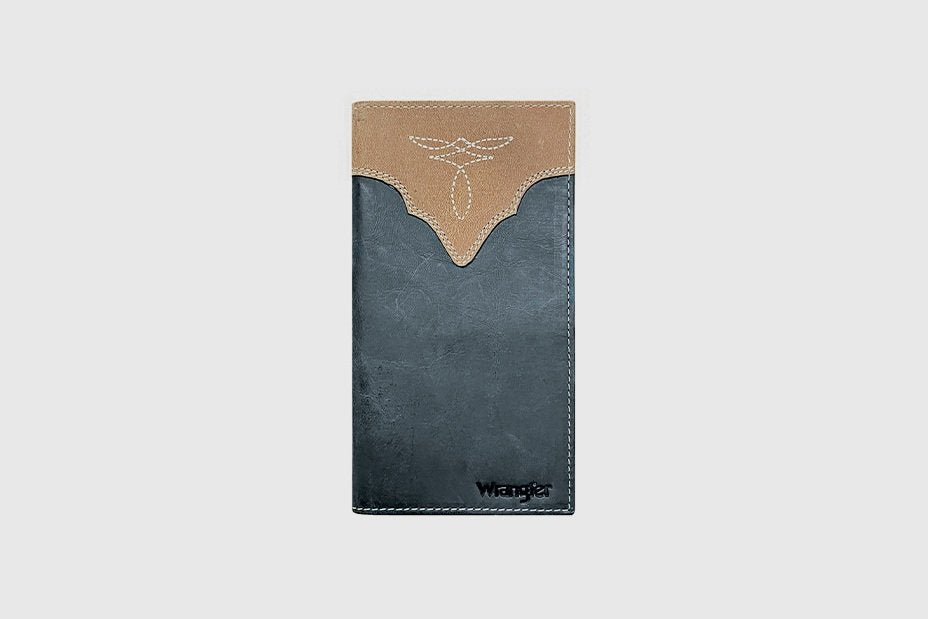 Crazy horse leather body with crazy horse leather overlay featuring accent toe bug stitch. Wrangler logo embossed on magnetic clip.