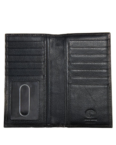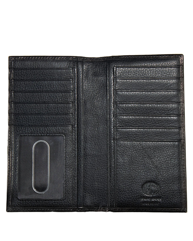 This authentic leather M&F Western Products 3D rodeo wallet features a black roughout body, black leather edge, and black buck lace. The interior includes multiple card and cash slots, a checkbook slot, and an ID window for added convenience.