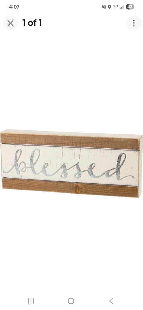 A slat wood box sign lending a galvanized "Blessed" hand lettered sentiment with color blocked accents. Easy to hang or can free-stand alone. Complements well with coordinating design pieces for a great gift set or rustic décor collection.
