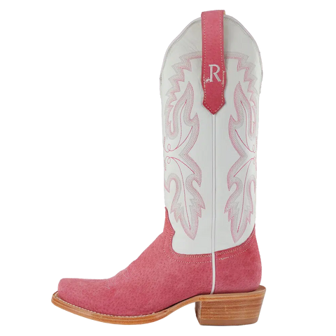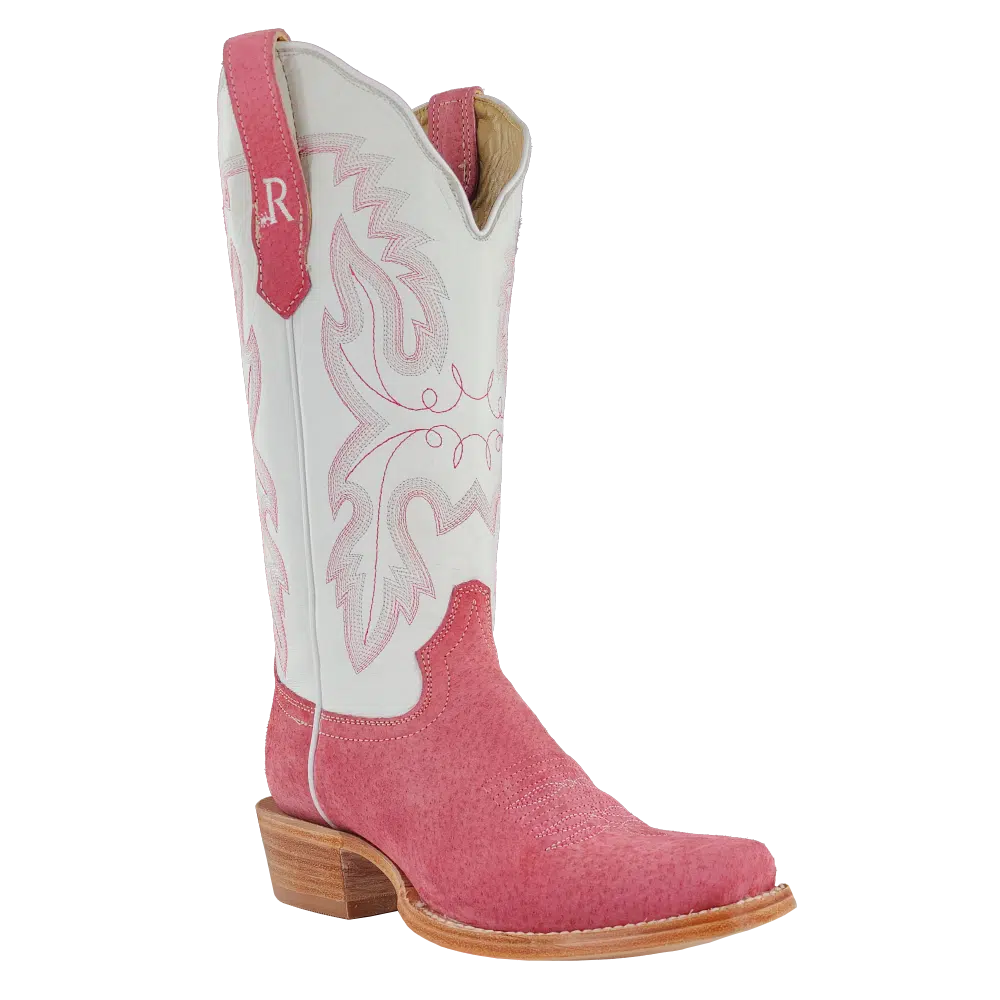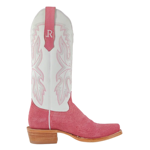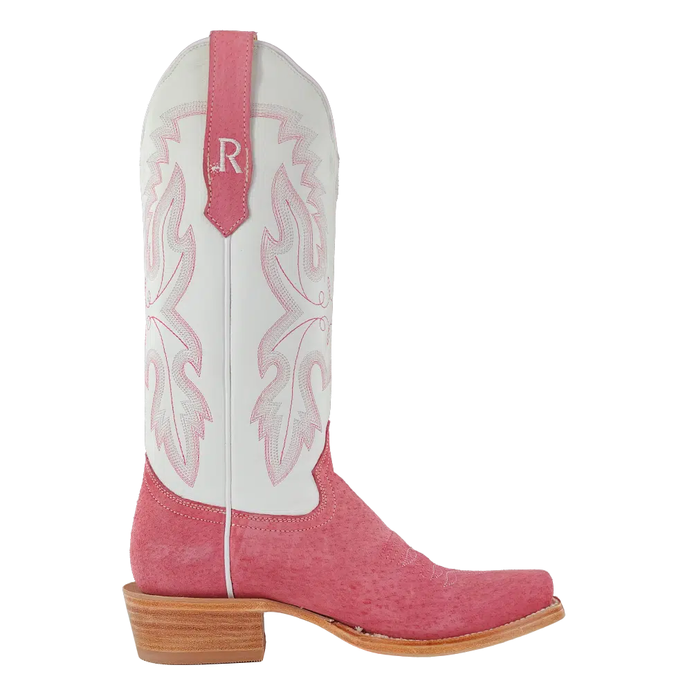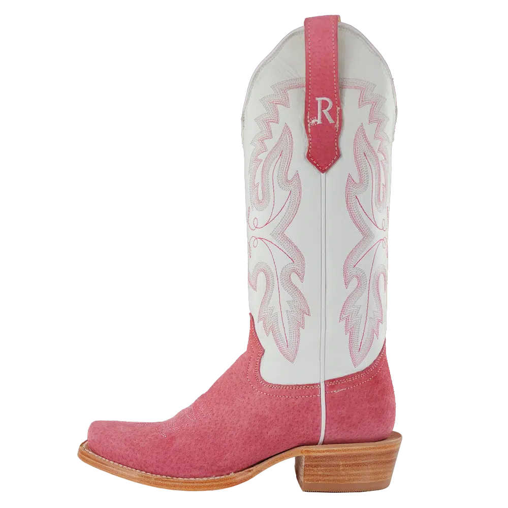 R. Watson presents these rose boar and winter white cowhide western boots. These boots have a 10 row stitch pattern, R. Watson comfort system, all leather stacked heel, counters, solid steel shank, and 10 iron outsole. 13″ total in height.