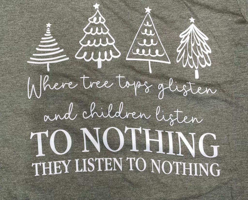 This 50% cotton, green T Shirt is the perfect addition to your holiday wardrobe. With a cute, fun, and trendy saying of “Where tree tops glisten and children listen to nothing they listen to nothing.”