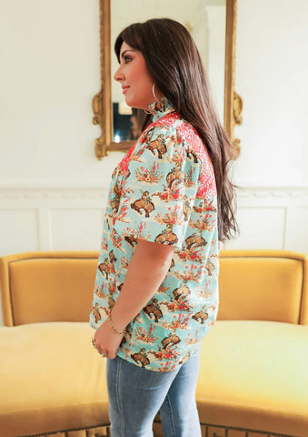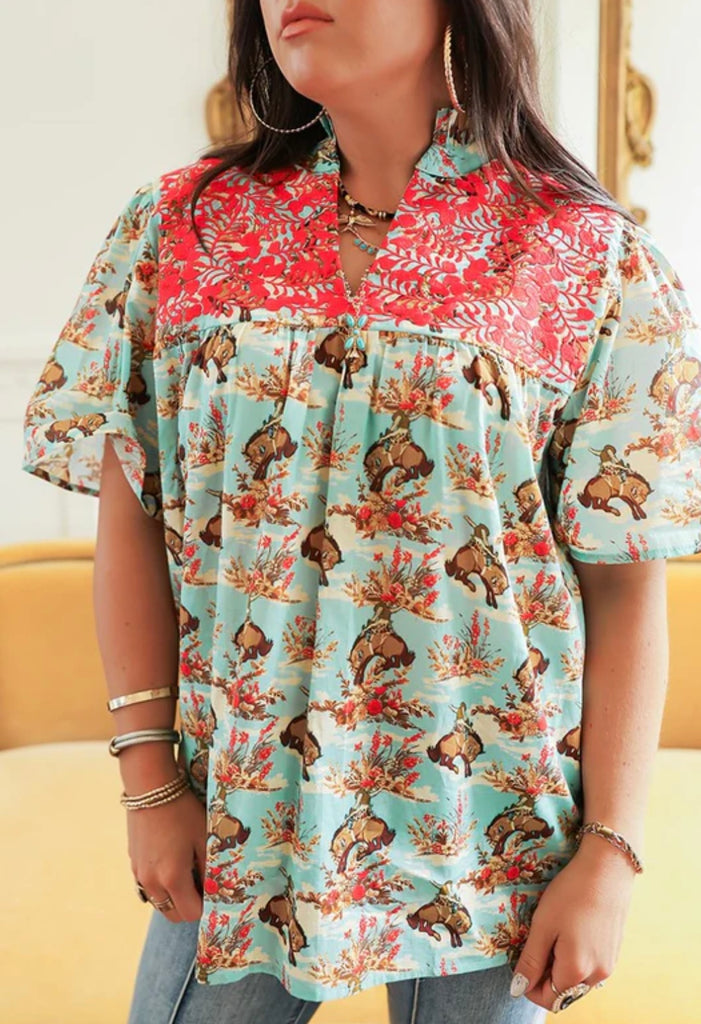 Funky and Western? Sign me up! The Reece body style is featured with bright red embroidery across the chest and a fun bucking horse graphics on a blue background.