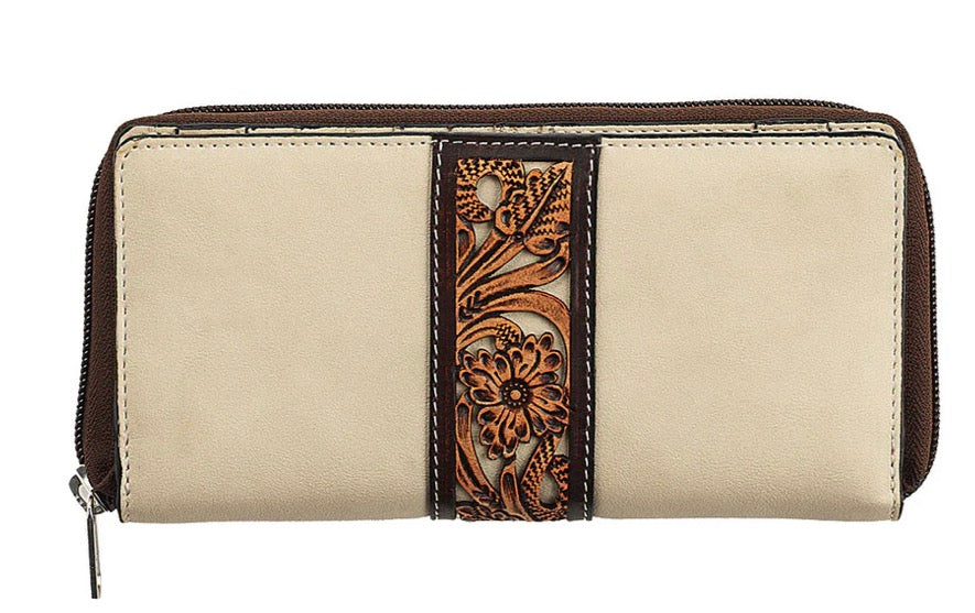 It features a man made material body with a leather floral filigree overlay. One back zippered pocket on outside. Inside there are multi cash and card slots along with an ID window. One large zipper change compartment with a center zipper compartment.